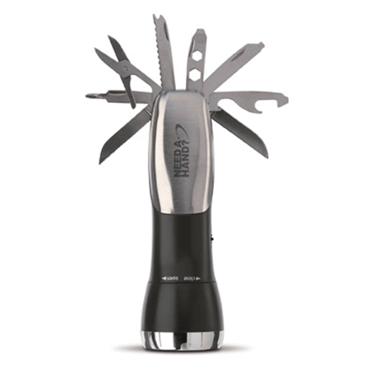 Lampe de poche compacte avec différents outils. Piles incluses. Gravure laser possible. Livré dans boite cadeau.