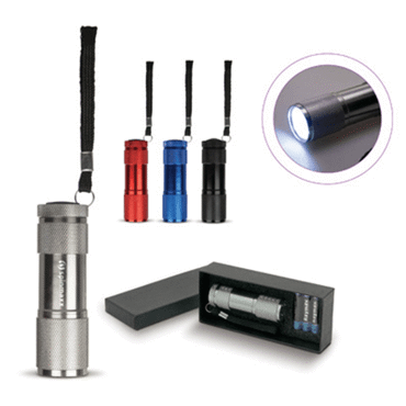 Lampe LED torche en aluminium avec dragonne. Piles incluse. Livrée en boîte individuelle.