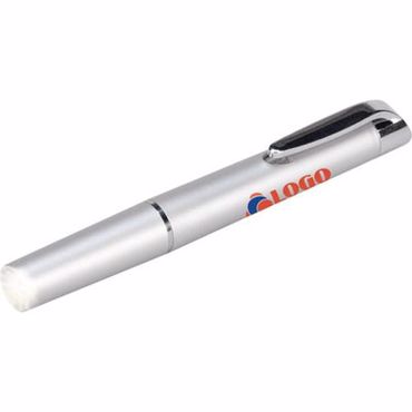 Lampe torche de diagnostic. Lampe torche en matière synthétique avec lampe LED blanche, clip et anneau en métal. Lorsque le clip et le corps entrent en contact, la lampe s'allume. Piles bouton incluses. Dans une boîte. argenté