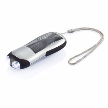 Lampe torche solaire personnalisée. Lampe solaire de poche. Boîtier en ABS argent, panneau solaire avec batterie 1,2V/40MAH NI-MH, peut être chargé avec 2 piles AAA (non fournies), 2 LED blanches..
