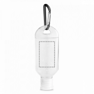 Gel hydroalcoolique en flacon PETG de 50 ml avec capuchon rabatteble et mousqueton. Formule chimique avec 68% d'alcool. C'est un produit cosmétique. Pratique à emporter et à utiliser n'importe où. Mentions légales disponibles en: [PT | EN | ES | FR | IT | DE | CZ | SK] 45 x 120 mm