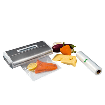 Machine à emballer sous vide, finition inox, aspiration automatique ou pulse pour moduler en fonction de la consistance des aliments, débit de la pompe : 800 mbar, puissance d'aspiration max : 560 mmHg / 75kpa, débit d'air max : 16 L / min, largeur de la soudure 3 mm, possibilité de souder sans mise sous vide, tableau de commande avec touches sensitives et témoin lumineux, livrée avec un rouleau d?ensachage de 22 cm x 5 m