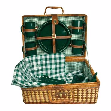 Mallette pique nique. Profitez d' un bon pique-nique à 4, avec cette corbeille en rattan. Inclus: Vaisselle et ustensiles en plastique + nappe de table. Poignées pratiques. Compartiment principal très spacieux. Le marquage se fera sur une étiquette (jusqu' à 4 coul.)