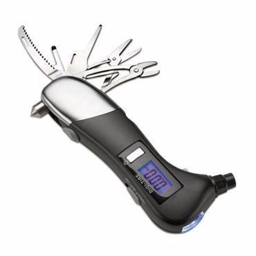Manomètre outils multifonctions. Manomètre pour pneus avec lampe, CE, Couleur diode blanche, Couleur diode Eclairage, coupe ceinture, couteau, mini couteau, piles incluses, pinces, poignée plastique, tournevis, éclairage de l'écran, métal, plastique, emballage