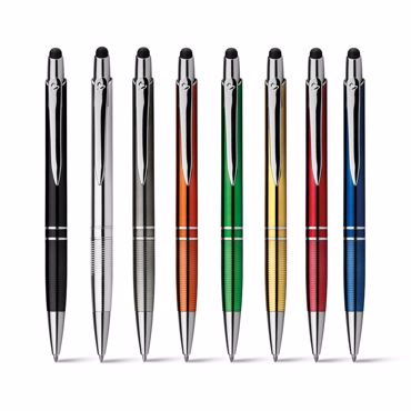 Stylo à bille en plastique avec traitement de surface UV de l’apparence métallique, clip métallique, stylet pour écrans tactiles, encre bleue. Épaisseur de la mine 0.7 mm, encre à basse viscosité. ø10 x 139 mm