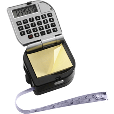 Mètre-ruban en plastique de 3 m avec calculatrice, papier repositionnable et clip métal, pile incluse.