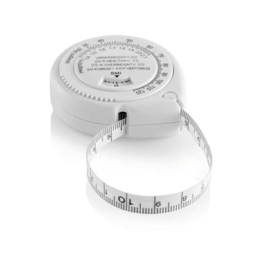 Mètre 1,5cm/6mm, boîtier en ABS blanc, tableau de comparaison poids/taille.