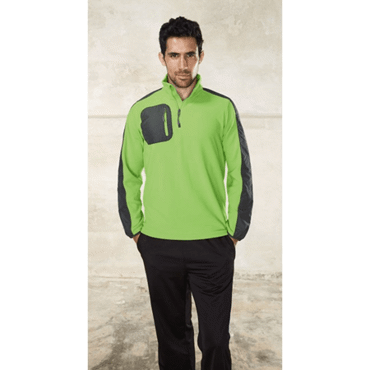 100% polyester micropolaire anti-boulochage avec empiècements en tissu contrasté à motif sur manches, épaules et poche. 1 poche poitrine zippée. Bas de manches avec bande élastique. Grammage du produit : 180 gr/m²