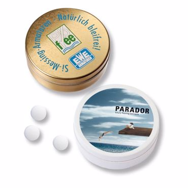 Boîte XS "personnalisée" blanche, argentée ou dorée, réutilisable, opercule fraîcheur avec languette douverture env. 20 g de Bonbons-XS aux fruits Kalfany (citron, orange, fraise), candissage à sec, ou env. 20 g de pastilles à la menthe Ø 9 mm, sans sucre. Possibilité d'obtenir la garniture avec : tic tac, Pulmoll, Chewing gum sans sucre. Avec supplément.