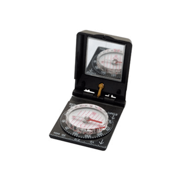 Mini- boussole de visée avec miroir. Support en plastique noir. Capsule rotative en plastique avec cadran gradué en blanc sur fond noir pour une lecture facile. Miroir de visée. Règle graduée en mm. Avec cordelette.
