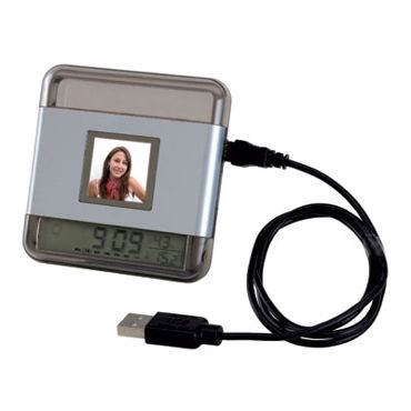 Mini cadre photo numérique avec station météo, affichage de l´heure digital, affichage de la date, thermomètre, Port USB (cable env. 60 cm), Écran : 2,6 x 2,5cm, définition: 128x128 Pixel, mémoire 8MB, pied rétractable, recharge (incluse) via le port USB.