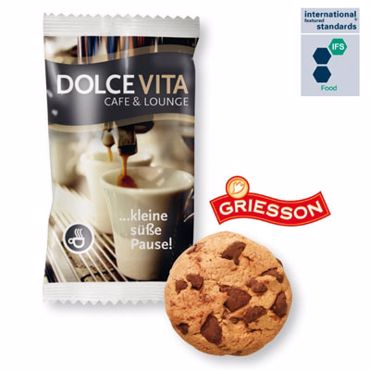 Mini Cookie, petit sablé aux morceaux de chocolat au lait et chocolat noir (40 %), en sachet transparent ou blanc. Note: Les biscuits sont susceptibles de se briser.