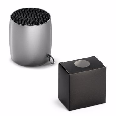 Mini enceinte avec micro. ABS. Avec transmission bluetooth et branchement stéreo 3.5 mm. Avec 2W/4O. Autonomie jusqu'à 4 h. Fonction pour décrocher appels, contrôle du volume et connexion aux playlists des dispositifs mobiles. Inclus câble USB pour chargement. Livré dans coffret cadeau. ø35 x 38 mm | Coffret: 65 x 65 x 45 mm