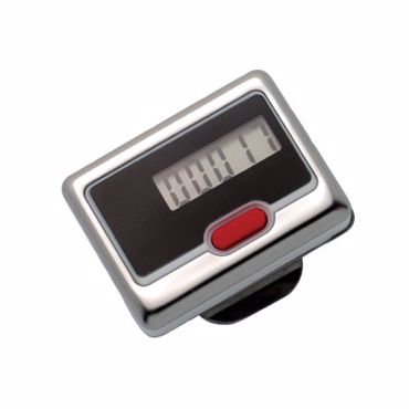 Mini podomètre électronique (compteur de pas). Boîtier en acier avec clip de ceinture.