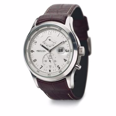 Montre acier automatique. Boîtier acier brillant, mouvement automatique avec date et 24 heures, affichage de réserve d´énergie, cadran imprimé avec index imprimé/en gravure chimique, logo en relief collés, bracelet cuir plat souple, étanche 10 ATM