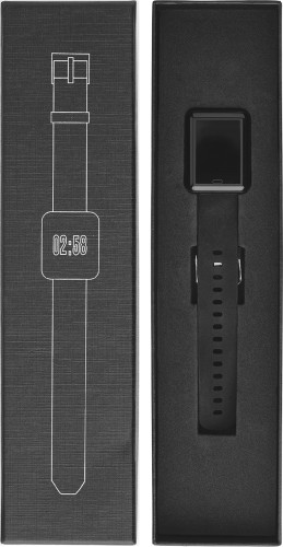 Montre connectée en ABS et TPU avec bracelet en silicone avec fonctions podomètre, distance parcourue, rythme cardiaque et mémorisation du sommeil. Gère les selfies, les appels ainsi que les notifications App.