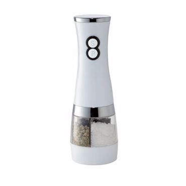 Moulin à épices 2 en 1, salière & poivrière électique. La salière et poivrière électrique offre un design fluide et la qualité du broyage céramique. Finition blanche avec attributs chromés. Livré sous coffret noir. Piles 6 x UM3 (excl.).
