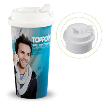 Mug blanc de voyage en plastique avec couvercle verrouillable. Convient pour l'impression par sublimation. S'ouvre en dévissant.
