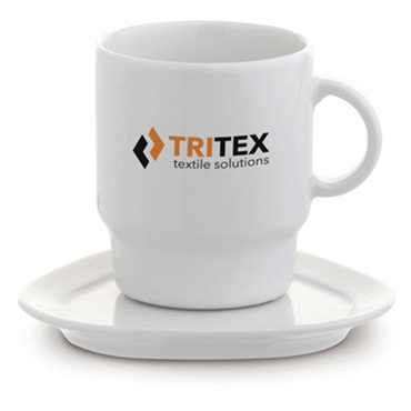 Mug et soucoupe de la série 'Satellite' en porcelaine de haute qualité. Le mug est empilable. Le mug offre une grande surface de marquage et la soucoupe peut être, elle aussi, marquée.