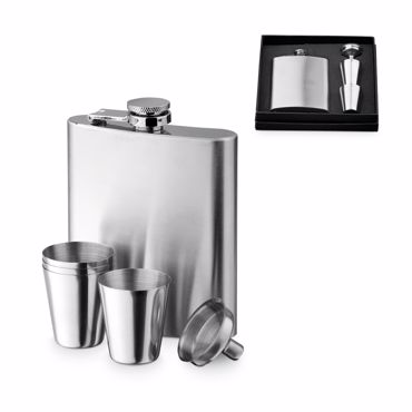 Set de flasque en acier inox, contenance 200 ml, entonnoir et 4 gobelets, contenance 4x20 ml, livrée dans une boîte de cadeau.