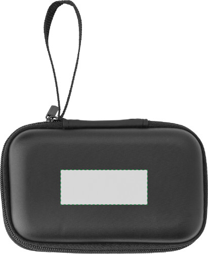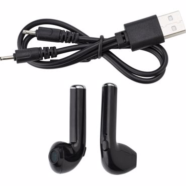Etui zippé en PVC comprenant des écouteurs sans fil en ABS livrés avec câble de charge.