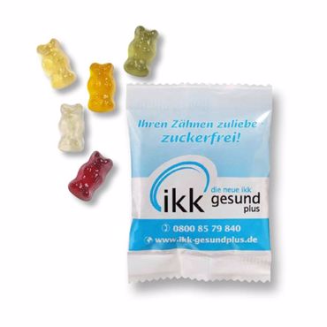 oursons gélifiés sans sucre, avec arômes naturels et colorants végétaux, couleurs assorties, avec sirop de Maltitol, en sachet transparent ou sous cellophane luisant blanc Autres formes de bonbons gélifiés standards disponibles à partir de 32.000 sachets de 10 g.