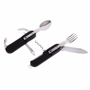 Outil multifonction "Wildlife" , 7 pièces: couteau, fourchette et cuillère rétractables, ouvre-boite, décapsuleur et anneau porte-clés dans un étui avec passant pour ceinture et fermeture velcro