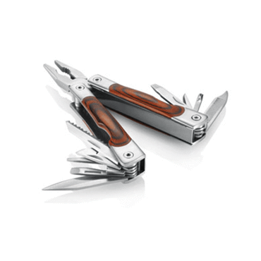 En acier inoxydable et poignée incrustée de bois pakka, 16 fonctions. Pochette incluse.