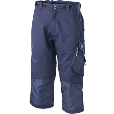 Pantalon de sécurité 3/4 Homme. -2 poches latérales. -1 Poche sur les cuisses et 2 poches arrières. -Insert pour genouillère. -Taille élastiquée avec passant pour ceinture. -Fermeture éclaire. -et boutons. -Renforts aux genoux et hanches. -65 % polyester 35 % coton. -CORDURA®: 100% polyamide. -CORDURA® : Tissu de renfort pour vêtements de travail. -