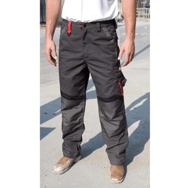 ·270 g/m² ·65% polyester, 35% coton ·tissu contrasté aux genoux: 210 g/m², 100% polyester ·fermeture à glissière avec rivets ·taille élastiquée et passants pour ceinture ·diverses poches ·poches externes pour genoullière ·triple surpiqûre et bartacks aux poches et points sous pression ·bande réfléchissante décorative ·convient à la broderie