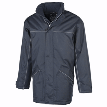 Enduction Imperméable. 2 poches extérieures zippées. 2 poches intérieures. Capuche en oxford dans le col. Col doublé polaire. Patte auto-agrippante aux manches. Accès pour personnalisation. passepoil réfléchissant aux manches, devant et poches - Extérieur : 100% polyester oxford imperméable. Intérieur : 100% polaire matelassé.
