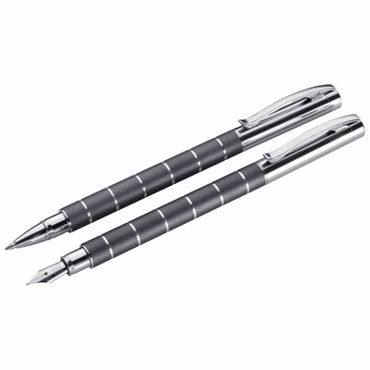 Parure de stylo design. Montrez votre style ! Étonnez vos clients avec cet élégant set d'écriture. Il se compose d'une trés bel étui, d'un stylo à bille en plastique à encre noir et d'un stylo à plume à encre bleu. Les deux stylos ont un corps coloré au charbon de bois entrecroisé par 5 anneaux en métal et un capuchon en métal. Possiblité de gravrure laser sur les deux capuchons.