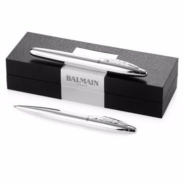 Parure de stylo Reims de Balmain. Parure stylos roller / bille Reims de Balmain. Pour ceux qui aiment avoir un stylo de grande taille. Stylos chromés brillants livrés en écrin luxe.