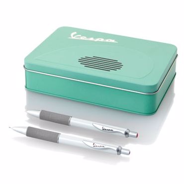 Parure de stylos Vespa. Les designs du stylo et du crayon-mine sont inspirés de la poignée d'accélération et des couleurs historiques de Vespa. Ils sont présentés dans une boite cadeau métal représentant le panneau latéral du fameux GS.