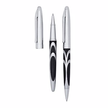 Parure de stylos BROADWAY Parure stylo bille et roller en métal, finition chromée brillant et noir. Coffret noir. Couleur écriture: Bille bleue, roller noir.