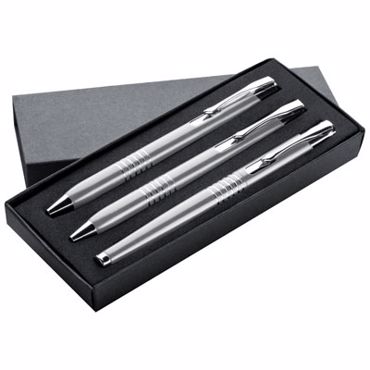 . Set en aluminium de 3 pièces : stylo bille, porte-mine et stylo plume avec 6 anneaux décoratifs sur le corps. noir, bleu, rouge, gris, vert, orange