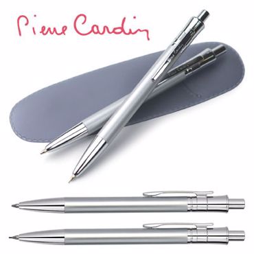Parure écriture Pierre Cardin. Le stylo à bille, le porte-mine ou la parure sont présentés dans une pochette grise. Les prix comprennent un marquage en 1 couleur ou une gravure au laser à un endroit sur les 2 pièces.