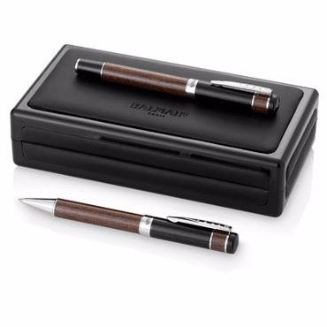 Parure Fontainebleau de Balmain. Cette magnifique parure imitation bois comprenant stylo à bille et stylo roller est livrée dans un écrin luxe.