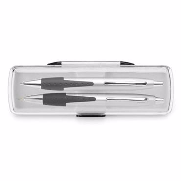 Parure stylos aluminium. Parure de stylo bille et porte-mine en aluminium avec embase en gomme dans un écrin en plastique, mine bleue.