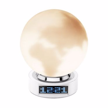 Pendulette lampe sensitive. Lampe sensitive avec réveil multifonctions sur écran LED bleu. Le globe rotatif de la lampe émet une lumière relaxante. Adaptateur DC9V fourni et 3 piles AAA non fournies.