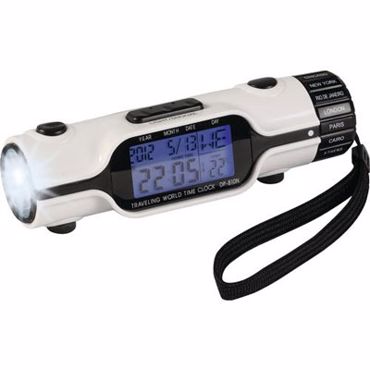 Pendulette lampe torche. Horloge avec fuseaux horaires et lampe de poche en matière synthétique. L'horloge est pourvue d'une alarme, minuteur, date, jour de la semaine, température (C°/F°) et heure locale de 18 villes mondiale (mode 12/24). Avec éclairage du fond bleu. Lampe de poche avec 3 lampes LED à forte lumière blanche à économie d'énergie. Piles bouton incluses, poignée et mode d'emploi.