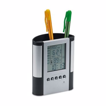 Pendulette pot à crayons. Station météo MULTI Pot à crayon avec alarme, date et thermomètre. 1 pile bouton incluse.