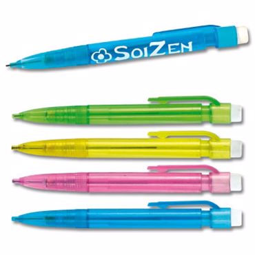 Petit porte mine publicitaire. Porte-mine. Petit modèle : 9,5 cm. Corps translucide, rechargeable, rétractable, gomme, clip, mines 0,5 mm.