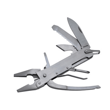 Pince multifonctions en acier inoxydable avec étui de ceinture en nylon noir : pince de précision / pince de serrage / pince coupante / tournevis plat 7 mm / tournevis plat 3 mm / tournevis cruciforme / couteau / ouvre boîte / scie / lime à métaux.