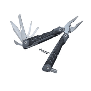 Pince multifonctions en acier inoxydable CR13 hautement résistant à l'oxydation. Manche ergonomique bi matière anti-glisse en plastique ABS et résine TPR (Thermo Plastic Rubber) de couleur grise. Blocage de sécurité nouvelle génération (déblocage facile). 21 fonctions : pince universelle/ pince coupante / dénudeur / couteau / ouvre boîte / poinçon / scie / tire-bouchon / passe fil/ 3 tailles de tournevis plats / 4 tailles de tournevis cruciforme / 5 tailles de clé alêne. Livrée avec un étui nylon doublé néoprène de couleur noir. Dureté en rockwell de la pince: 48; dureté en rockwell des accessoires : 51. Le TPR (ou TPE en français) est une matière thermo plastique proche du caoutchouc qui offre une excellente robustesse doublée d'une forte élasticité. Cette matière, idéale pour les manches de tout type d'ustensiles, offre une excellente prise en main. A noter que ses déchets sont recyclable à 100%.