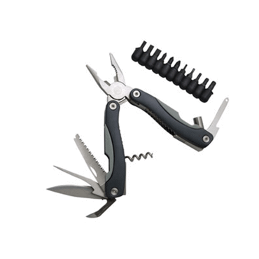 Pince multifonctions professionnelle en acier inoxydable hautement résistant (2CR13). Assemblage vissé. Blocage de sécurité nouvelle génération (déblocage facile). 18 fonctions : pince universelle/ pince coupante / couteau / ouvre boîte /poinçon / scie / tire-bouchon / passe fil/ 3 tailles de tournevis plats / 3 tailles de tournevis cruciforme / 5 tailles de clé alêne. Livré avec un étui de ceinture en nylon. Dureté rockwell pince: 48; dureté rockwell accessoires: 51.
