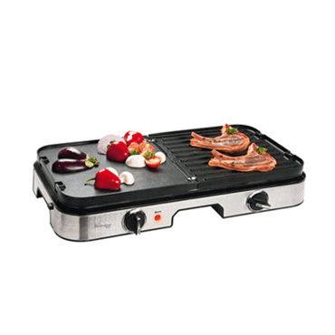 Plancha gril électrique, 2 plaques antiadhésives, amovibles et interchangeables, 2 thermostats indépendants pour 2 espaces de cuisson, témoins lumineux de fonctionnement, plateau de récupération des graisses, compatibles lave-vaisselle, surface de cuisson 25 x 50 cm