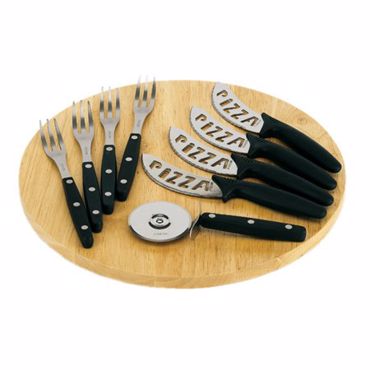 Planche à pizza ronde avec 4 fourchettes, 4 couteaux et une roulette