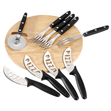 Planche à pizza 4 personnes en bois, molette de découpe, 4 couteaux dentés, 4 fourchettes en inox