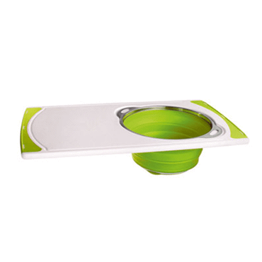 Planche de travail et de découpe en plastique polypropylène, poignées en silicone, passoire en silicone pliable intégrée Ø 24 cm, pourtour et fond en acier inoxydable, base et paroi perforées, gain de place grâce à son système de pli astucieux, moins de 4 cm de hauteur pliée, 12 cm de hauteur déployée
